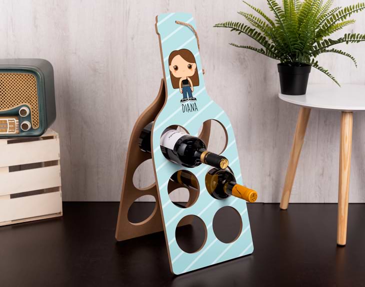 Amantes del vino, ¡tenemos el regalo perfecto para vosotros! Se trata de un soporte de botellas de madera personalizado con nuestra Familia Tinok. Lo mejor de todo es que podrás personalizarlo con el personaje que más se parezca a esa persona, o mejor aun, ¡crear su propio muñeco Tinok desde cero! Cara, pelo, ropa, accesorios...¡no faltará detalle! Podrá colocar hasta 6 botellas de sus vinos favoritos, además de ser muy práctico para almacenaje, es ideal para decorar su casa y darle un toque muy acogedor. Ahora solo queda llenarlo con sus bebidas preferidas, ¿tinto, blanco o rosado? Ya sea como regalo de cumpleaños, de aniversario, o incluso para Navidad, no hay mejor regalo para amantes del vino, ¡así podrá disfrutar aún más de sus copitas! A partir de ahora no tendrá excusa para hacer en casa las mejores catas. Medidas: 19 cm x 55 cm. Material: madera.
