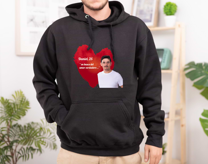 ¿Cómo te definirías ante el mundo? A parte de con tu nombre y edad, piensa en esa frase original, graciosa o bonita con la que te gustaría que todo el mundo te conociera. ¡Llévala contigo a todas partes con esta camiseta o sudadera de manga corta o larga personalizada! Escoge el modelo, talla y color que mejor se ajusten a ti o a la persona que quieras sorprender. Si eres fan de esas primeras citas a ciegas, ahora puedes personalizar al estilo del programa de Cuatro “First Dates” estas originales prendas de ropa. Tan solo tienes que decirnos el texto que quieres que salga como los entrevistados del programa. Y por supuesto, podrás añadir tu imagen junto al corazón. Cuando vayas por la calle con ella, todos caerán rendidos ante ti. Lo mejor de todo es poder compartirlo, así que este puede ser un sorprendente regalo original para San Valentín. Por tan solo 5€ más, puedes añadir a otra persona en tu camiseta o sudadera personalizada. ¡Que todo el mundo sepa el amor que os une! Recomendaciones para tu foto: -La imagen deberá ser lo más clara y nítida posible con bastante luz, ya que se recortará exactamente de la que se adjunte. -La persona no deberá aparecer muy alejada, con una altura mínima de medio cuerpo (este es el tamaño con el que aparecerá en el producto). -Recomendamos que aparezca la persona sobre un fondo lo más uniforme posible, y sin agarrarse a otras personas. Que se le vean todas las facciones del medio cuerpo. -En el caso de escoger la opción de 2 personas, ambas deberán aparecer separadas para poder recortarlas bien individualmente. Material: - Algodón: manga corta- 100% algodón; manga larga- 100% algodón. - Tacto algodón: 100% poliéster cotton touch. - Técnicas: 100% poliéster. Importante: Las medidas son aproximadas, pueden variar 5cm por encima o por debajo.