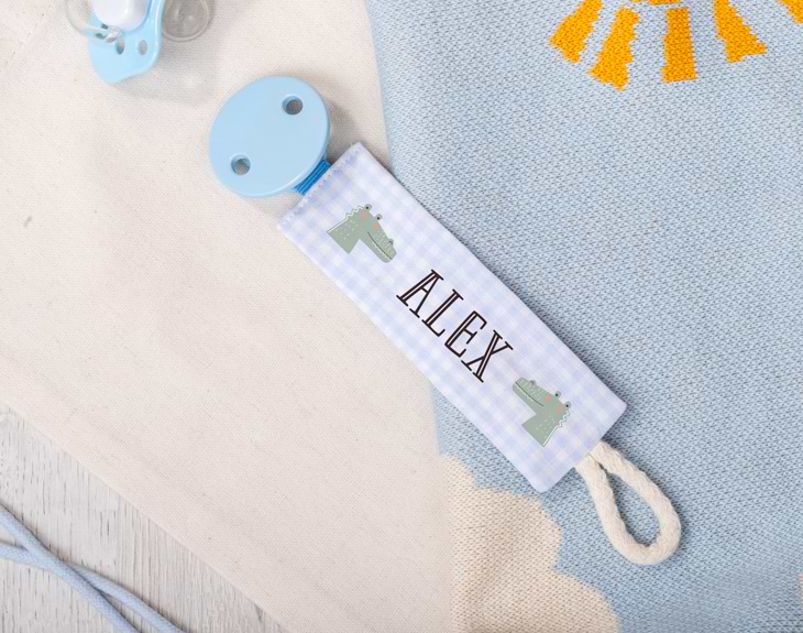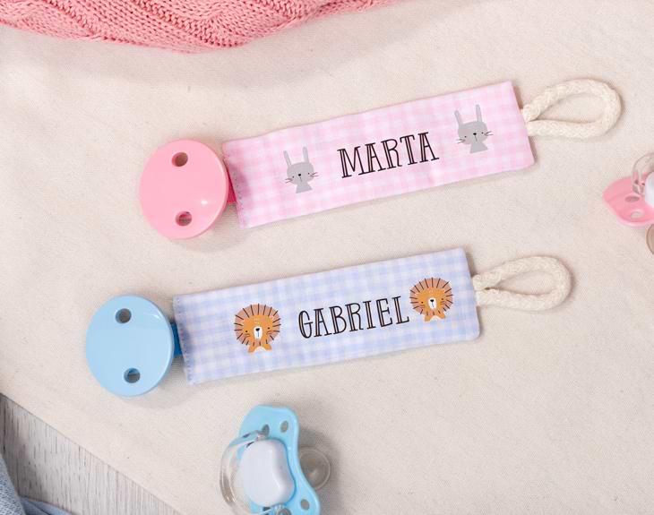 El nacimiento de un bebé siempre es maravilloso. Después de unos meses duros de cuidados y dolores, cuando por fin llega al mundo, es motivo de celebración. Si tu familia ahora tiene un miembro más y quieres tener un detalle con los padres del recién nacido, este es un regalo súper especial para padres. Se trata de nuestra cinta para sujetar chupetes. Es ideal para asegurar que el chupete esté siempre dentro del alcance del bebé y, sobre todo, para evitar que se caiga al suelo y se ensucie o se pierda. La cinta es de tela con un estampado de cuadritos, tiene una pinza para sujetarlo a la ropa del recién nacido. Además, está decorada con unos animalitos y existe la posibilidad de elegir el que más te guste. Hay un montón para escoger: mapache, cebra, jirafa, cocodrilo, león, elefante, conejo. ¡Son todos adorables! Lo más especial de esta cinta, es que es personalizable. Podrás escribir el nombre del recién nacido, ¡así todos sabrán cómo se llama el pequeñín! Para personalizarlo, lo primero es añadir el producto al carrito y entrar al área de personalización. Además, puedes elegir entre el color azul o el rosa.