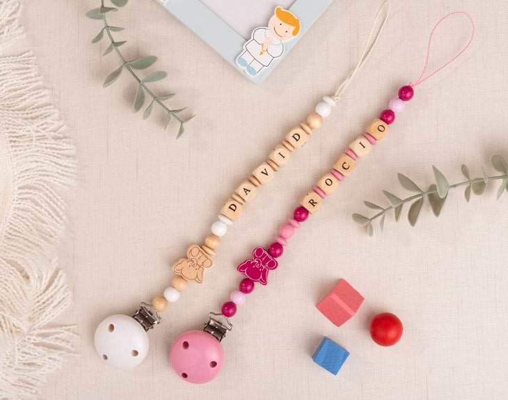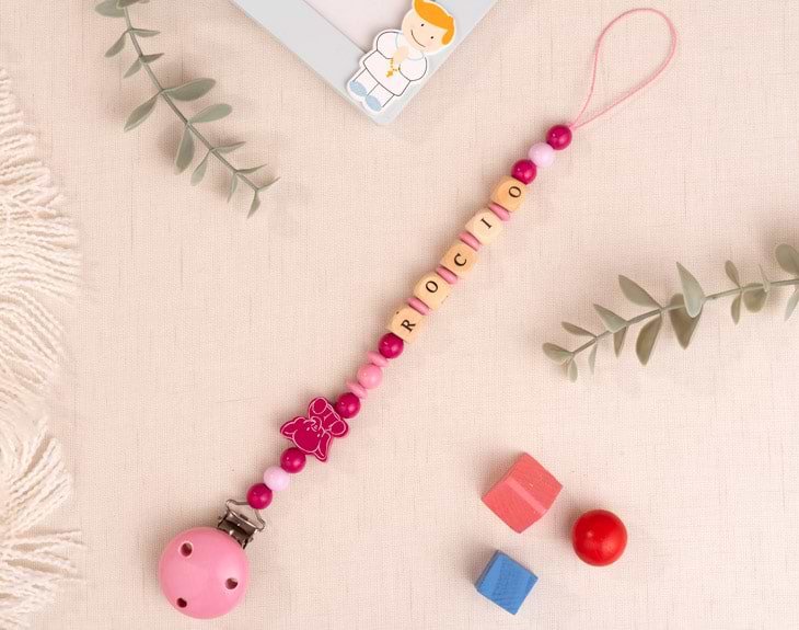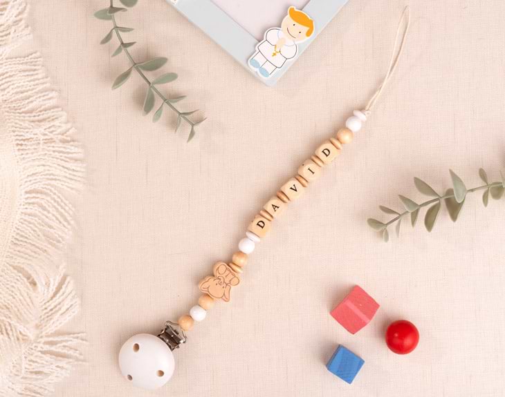 ¿Cuál es el mejor regalo para un bebé? Sorprende a esos padres primerizos con este sujeta chupetes personalizado con el nombre del bebé que está en camino. El nuevo miembro de la familia tendrá su primer regalo personalizado con su nombre, que además les encantará a los padres. Un regalo bonito y muy práctico que hará que el chupete siempre esté cerca del pequeño de la familia. ¡Podrás poner el nombre que quieras! Este precioso detalle para bebés es genial para sorprender y emocionar a esos papis primerizos. Con este original sujeta chupetes triunfarás en cualquier celebración y será ese primer regalo que nunca olvidarán y que será un recuerdo para siempre. El enganche redondo de un extremo se acoplará cómodamente a su ropita, mientras que en el otro extremo tendrán una cuerda para atar el chupete del bebé. Este accesorio hará que los papis no se tengan que preocupar del chupete. Personalizar este sujeta chupetes de madera es muy sencillo. Elige el color (blanco o rosa) y añade el producto al carrito. Ahí, te pediremos que escribas el nombre que quieres ver en la cadena y nosotros nos encargamos de que quede perfecto. Recuerda que podrás seleccionar máximo 10 letras. ¡Será el regalo más tierno del mundo! ImportanteNo se recomienda el uso de esterilizadores eléctricos con este producto.