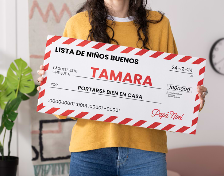 ¡La Navidad ya está aquí! Sin duda, es una de las mejores épocas del año, llena de magia e ilusión. Si quieres sorprender al más peque de la casa por haberse portado tan bien a lo largo de año, tenemos la tableta gigante personalizada con diseño "Cheque de santa". Lo mejor de esta tableta es que es personalizable, podrás escribir el nombre que tú quieras. Es súper tableta está formada por una caja de cartón de 58 x 28 centímetros y el relleno que más os guste y que podéis elegir más adelante. Milka, Kit Kat, Valor, Jungly, Lindt, Kinder… ¡Hay para todos los gustos! Personalizar esta tableta gigante es muy sencillo. El primer paso a seguir consiste en añadir el producto al carrito y entrar al área de personalización. Una vez ahí, ya puedes escribir el nombre que tú quieras. Pronto estará perfecto y listo para regalar. ¡Será un original regalo para Navidad! Medidas de la tableta gigante: 58 x 28 centímetros. Elige una opción de relleno: • 28 barritas de Huesitos. • 6 tabletas de Jungly. • 9 tabletas de Nestlé Dolca. • 9 tabletas de Milka (surtido): chocolate, chocolate blanco, Chips Ahoy y Oreo. • 9 paquetes de Kinder. • 15 paquetes de Kit Kat. • 5 tabletas de Valor (surtido) • 9 tabletas de chocolates Lindt (surtido): Figue Intense, Limón, Orange Intense, Caramel, Chili, Sésamo y Flor de sal.