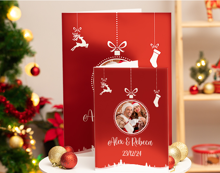 El momento más especial de la Navidad es reunirnos con nuestra familia y seres queridos y montar el árbol de Navidad: es una decoración súper personal que se quedará para el resto de estas fechas tan especiales adornando la casa. Seguro que cada persona del núcleo familiar tenéis vuestro propio adorno que colgar y os lo pasáis en grande. Por ello nuestra tarjeta de felicitación personalizada es el detalle ideal que regalar a esas personas con las que la Navidad es aún más especial. Con esta tarjeta podrás poner 1 o 3 fotografías de una divertida manera en la que parecerán adornos que cuelgan de un árbol, conjuntada con su precioso diseño navideño le encantará a cualquiera que la reciba y le hará acordarse de esos momentos tan especiales que ha vivido contigo. Si eliges la opción interior personalizado podrás diseñar la tarjeta a tu gusto: añadir fotos, stickers... ¡Será 100% diseño tuyo y original! Nuestras tarjetas están disponibles en 2 tamaños: gigante y A4. La gigante es súper vistosa y la A4 más discreta y fácil de transportar, pero ambas son maravillosas y un regalo original que se quedará en el corazón que la reciba durante toda la vida. Medidas (tarjeta abierta): Tarjeta gigante: 66 x 44 cm. Tarjeta A4: 42 x 29'50 cm.
