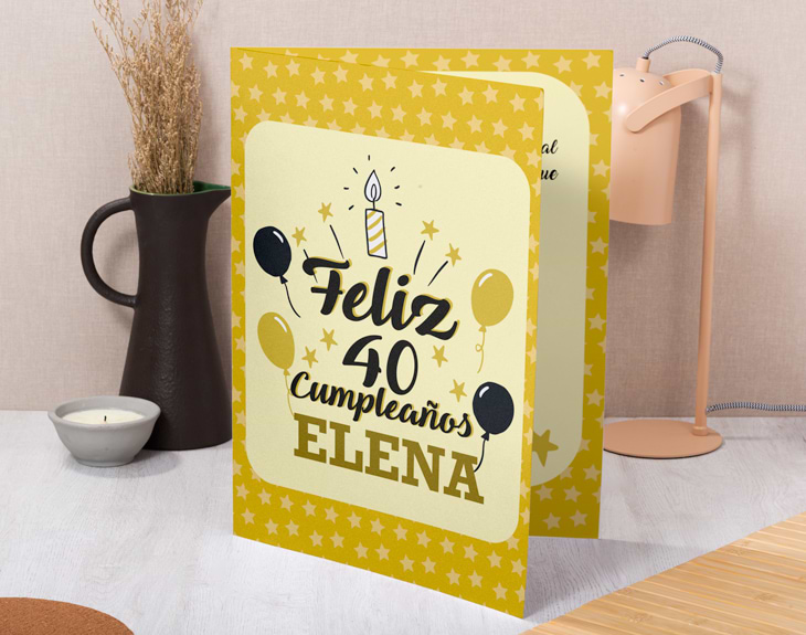 ¿Se acerca el cumple de la persona más elegante que conoces?¡Entonces esta tarjeta gigante es la mejor felicitación que puedes hacerle! Y es que, tiene un diseño en tonos dorados y negros que le dan un toque de lo más glamouroso. Solamente tienes que decirnos el número de años que cumple y su nombre, nosotros nos encargaremos de insertar estos datos en el diseño para hacerlo totalmente suyo. El dibujo contiene todos los elementos necesarios para hacer que una fiesta de cumple sea inolvidable: globos, confetti y velas. ¡Seguro que todo esto no falta en su día! Además, puedes personalizar únicamente el exterior de la tarjeta, o si quieres que sea más especial aún, personalizar también el interior con el texto o foto que quieras. ¡Se emocionará muchísimo al verlo! ¿Cómo se graba el mensaje? ¡Es muy fácil! Añade la tarjeta al carrito y dale al botón de "personalizar". Podrás grabar un mensaje en ese momento (con el micro del móvil o del ordenador) que nosotros nos encargaremos de incluir la tarjeta. ¡El único límite es tu imaginación! Medidas (tarjeta abierta): Tarjeta gigante: 66 x 44 cm Tarjeta A4: 42 x 29'50 cm Importante: a la hora de escribir el texto en el interior de la tarjeta, necesitarás darle al botón "ENTER" para crear diferentes párrafos. En el caso de escribirlo todo seguido, el texto irá todo en una línea, y el diseño saldrá tal y como le llegue a nuestro equipo de personalización.