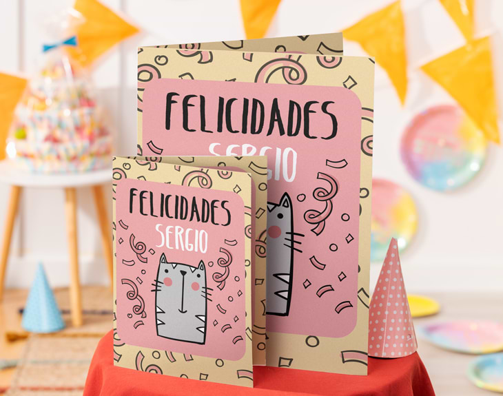 ¡El mejor regalo que puedes hacer a un cumpleañero o cumpleañera que adore a los animales! Si entre todos ellos, sus favoritos son sin duda los gatos, esta tarjeta gigante personalizada le dejará sin palabras. Y es que, además de ser la felicitación más original que ha recibido nunca, le encantará la idea de que tenga como protagonista a un divertido gatito. Solamente tienes que decirnos su nombre para personalizar el exterior de la tarjeta y lo insertaremos haciendo que sea la más especial de todas. En cuanto a la parte interior, tienes dos opciones, por una parte escoger la opción de que esté en blanco para poder escribirle el mensaje a mano, o comprarlo ya personalizado. De esta manera, puedes agregar las imágenes o textos que quieras en nuestro diseñador. Puedes ponerle un mensaje muy divertido o muy emotivo para que lo guarde siempre con muchísimo cariño. ¡Le encantará! Medidas (tarjeta abierta): Tarjeta gigante: 66 x 44 cm. Tarjeta A4: 42 x 29'50 cm. Importante: a la hora de escribir el texto en el interior de la tarjeta, necesitarás darle al botón "ENTER" para crear diferentes párrafos. En el caso de escribirlo todo seguido, el texto irá todo en una línea, y el diseño saldrá tal y como le llegue a nuestro equipo de personalización.