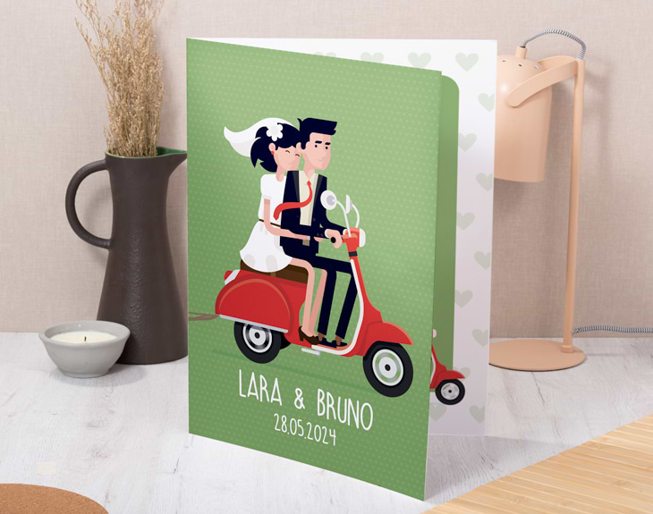 ¿Tienes pronto una boda y quieres sorprender a los novios con una felicitación muy original? Nuestra tarjeta gigante de boda es el detalle perfecto. Se trata de una divertida tarjeta de felicitación con un dibujo de los novios en la que puedes insertar su nombre y la fecha del enlace. Podéis aprovechar entre unos cuantos amigos y demostrarles lo felices que estáis por su compromiso y las ganas que tenéis de que llegue ese día tan especial y pasarlo genial...¡Vivan los novios y la boda del año! Además, podéis elegir la opción de personalizar únicamente la parte exterior de la tarjeta y dejar la interior en blanco para escribirla a mano, o seleccionar la opción de personalizar ambas caras y escribir directamente el mensaje o insertar una imagen en nuestro diseñador, ¡nosotros nos encargamos de dejarlo listo para entregárselo! Medidas (tarjeta abierta): Tarjeta gigante: 66 x 44 cm. Tarjeta A4: 42 x 29'50 cm.