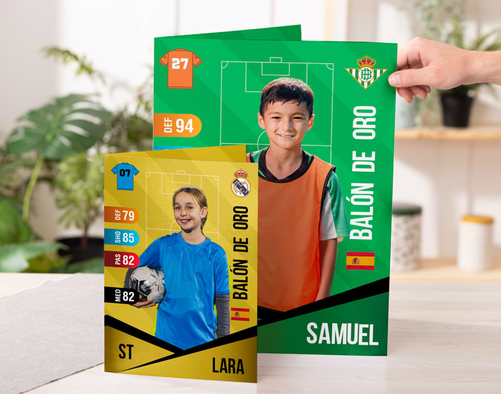 ¿Tienes en casa a un auténtico fan del fútbol? Si se acerca su cumpleaños, el final de temporada o cualquier ocasión especial, esta tarjeta personalizada con diseño "Cromo de fútbol" es el detalle perfecto para sorprenderle. Un diseño divertido y original que podrás personalizar al máximo: nombre, equipo, goles, asistencias… ¡lo que se te ocurra! Será su propia ficha de jugador, hecha a medida. Puedes elegir el tamaño que más se adapte al momento: formato A4 (aproximadamente 42 x 30 cm) o tarjeta gigante (unos 67 x 45 cm). Ambas opciones son igual de impresionantes, pero la gigante… ¡lo dice todo! Además, puedes decidir si la quieres con el interior en blanco para escribir una dedicatoria a mano, o personalizada para que llegue lista para entregar. Personalizarla es muy fácil: añade el producto al carrito y accede al área de personalización. Podrás completar todos los campos, elegir el color de fondo y previsualizar cómo quedará. Y un truco muy útil: en la foto principal del diseño, si haces clic en “Editar”, podrás borrar el fondo. Así parecerá un auténtico cromo de jugador o jugadora profesional. Importante: Si vas a escribir un texto interior, recuerda pulsar la tecla "ENTER" para crear saltos de línea. Si no lo haces, el mensaje aparecerá en un único párrafo., y el diseño saldrá tal y como le llegue a nuestro equipo de personalización. Medidas (tarjeta abierta): Tarjeta gigante: 67 x 45 cm. Tarjeta A4: 42 x 30 cm.