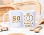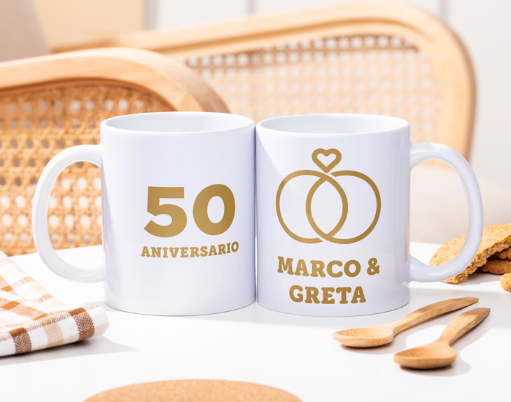 ¿Se acerca vuestro aniversario y todavía no tienes regalo para tu pareja? Tenemos la solución estupenda, esta taza personalizada con un diseño delicado de anillos es ideal para celebrar ese día tan especial. Es un detalle único, pensado solo para vosotros, y estamos seguros de que se derretirá de amor en cuanto lo vea. ¡Le va a encantar! El regalo de aniversario perfecto para sorprender desde el corazón. En las relaciones de pareja, los pequeños detalles cuentan y mucho. Una buena taza de café calentita siempre es una gran aliada para compartir un momento juntos, recordar los mejores momentos y disfrutar del amor en cada sorbo. Porque celebrar el amor desde el desayuno es, sin duda, una forma maravillosa de empezar el día. Puedes personalizarla con el texto que quieras y elegir el modelo de taza que más te guste entre nuestras opciones: desde las clásicas de cerámica hasta las tazas mágicas, que cambian con el calor. Nuestra taza con interior de color queda preciosa combinada con los tonos del diseño, y si buscas un toque aún más romántico para vuestro aniversario, te encantará la taza con asa en forma de corazón. ¡Tenemos opciones para todas las parejas enamoradas!