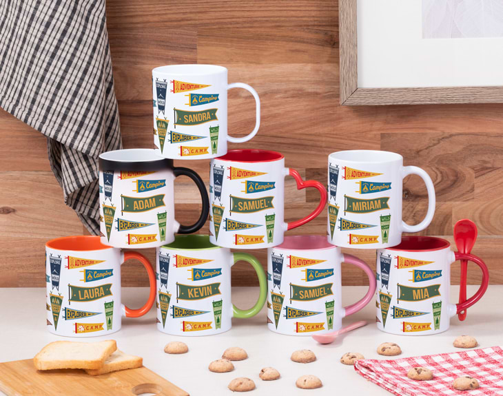El curso ha terminado y llega el verano. eso significa que es época de... ¡campamentos! Los más peques de la casa se van a pasar unos días fuera, en un entorno rural, con nuevos amigos y haciendo un montón de actividades todos los días. Pero para estar fuera de casa durante varios días, es necesario hacer la maleta. Por eso, no te puede faltar tu propia taza personalizada especialmente hecha para ir de campamento. Serás el más guay del campamento con esta súper taza. ¡Todo el mundo querrá una igual! Ir de campamento es vivir toda una aventura y por eso queremos que esta original taza te acompañe en todas y cada una de ellas. Además, es importante que en un sitio donde vas a vivir con tantos compis durante días, lleves una taza con tu nombre, así no la perderás nunca. Podrás elegir qué tipo de taza te gusta más entre los diferentes estilos que tenemos y personalizarla para que sea única. Si ya quieres saber como puedes personalizar esta taza, sigue leyendo. Elige el tipo de taza, añade el producto al carrito y entra en el área de personalización. Ahí, podrás ver este adorable diseño lleno de banderines con motivos de camping, escribe en uno de ellos tu nombre, colócalo como quieras y . ¡Tu taza para el próximo campamento está lista!