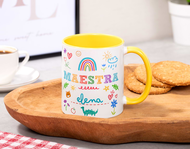Si hay algo que todo profe necesita es un buen café que le de la energía suficiente y que mejor que beberlo en esta preciosa taza personalizada cada mañana antes de ir a clase. Si queréis sorprender a vuestra maestra favorita, sin duda esta taza es todo lo que necesitáis. Queda muy poco para fin de curso, así que es el momento perfecto para hacerse con este original regalo que dejará sin palabras a esa profe que tanto a trabajado este año con todo sus alumnos. Y como sabemos que hay tantos gustos como personas, vais a poder elegir el modelo de taza que más os guste entre todos los que hay disponibles. ¡Será un regalo hecho a medida! Para personalizar esta taza, el primer paso es añadir la que hayas elegido al carrito. Después, entrarás en el área de personalización, donde podrás completar este divertido diseño con el nombre de la profe y listo. Una vez hayas hecho todo esto, espera para recibirla y disrutarla. ¡Es lo más!