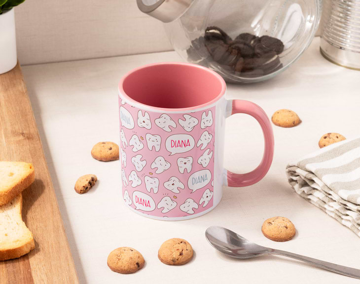 Si estás pensando en tener un detalle con esa persona tan especial, tenemos una opción chulísima. Se trata de nuestra taza “Dientes sonrientes”. Puede ser un regalo súper original para tú dentista de confianza o para ese amigo que se va a graduar en odontología, le dejarás sin palabras. ¡Será genial! Sin duda, acertarás seguro con esta taza, tiene un estampado de lo más original con un diseño de dientecitos sonrientes súper adorables. ¡Le encantará! Además, es personalizable, podrás escribir el nombre que tú quieras. Con esta taza conseguirás sacarle una sonrisa desde primera hora de la mañana. Personalizar esta taza es súper sencillo. El primer paso a seguir consiste en añadir el producto al carrito y entrar al área de personalización. Una vez ahí, escribes el nombre de esa persona tan especial y nosotros nos encargamos de todo lo demás. Pronto estará perfecta y lista para regalar. ¡Un regalo súper original! Al comprar este diseño podrás elegir el tipo de taza que quieres entre nuestras seis opciones disponibles en el desplegable: cerámica, mágica, plástico, con el interior en color, con cuchara o con asa en forma de corazón. En el lado derecho encontrarás la guía de tazas con las características de cada una de ellas. ¡Escoge el estilo y la cantidad de tazas que quieras!