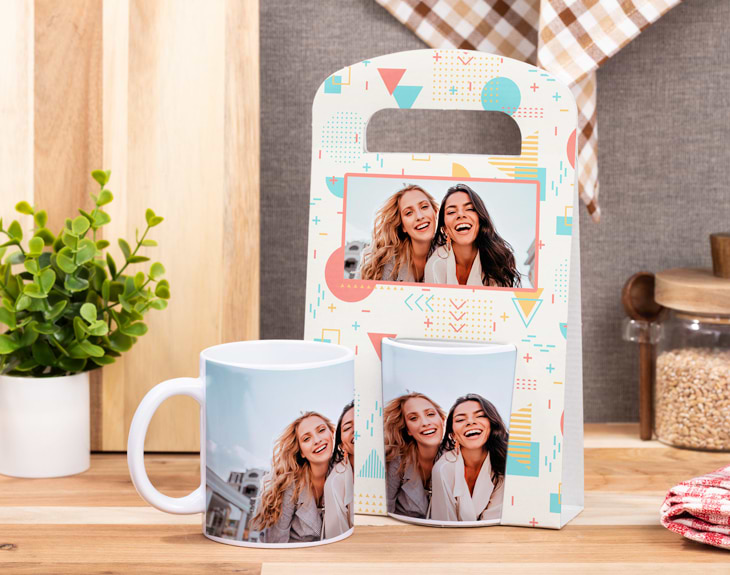 • Taza de cerámica personalizada (33cl). • Estuche personalizado • Tarjeta recordatoria.