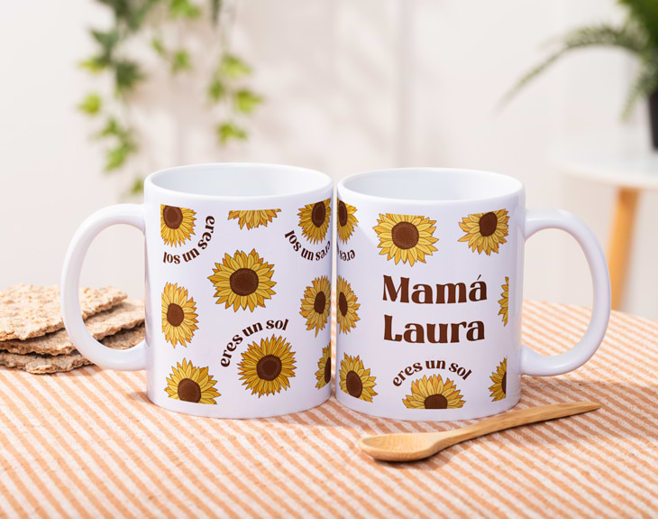 Hay personas que brillan con luz propia. Donde quiera que van, dejan una huella llena de alegría y energía, sin perder nunca la sonrisa. Y el mejor regalo que puedes hacerle a alguien así es esta taza personalizada "Eres un sol". No solo le encantará su diseño, sino que le harás sentir lo increíble que es. ¡Se convertirá en su taza favorita de cada mañana! Este detalle también es un regalo original para el Día de la Madre. Perfecto para mamás y abuelas, ya que esta adorable taza es personalizable. ¡Es ideal! Podrás poner el nombre de la persona que quieras y quedará espectacular, rodeado de girasoles y la frase "Eres un sol". Un diseño que robará el corazón de quien lo reciba. Personalizar esta taza tan especial es muy fácil. Solo tienes que añadir el producto al carrito, entrar al área de personalización y escribir el nombre o mensaje que desees. ¡En un par de clics tendrás el regalo más especial y lleno de significado! Además, puedes elegir entre varios tipos de tazas: cerámica, mágica, con el interior de color, con cuchara o con un asa en forma de corazón. ¡La taza perfecta para celebrar a esa persona tan importante en tu vida!