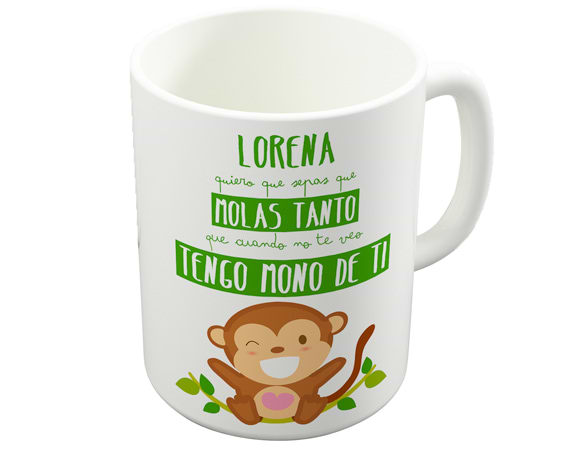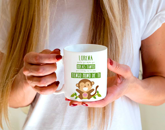 La taza personalizada ideal si tienes mono de esa persona a la que tanto quieres. Hazle este regalo original y sácale una sonrisa cada mañana en el desayuno. ¿Te imaginas desayunar todos los días en una taza donde te están diciendo que te quieren mucho? Esa sensación puedes conseguir tú si aprovechas esta oportunidad. Antes de pagar, te preguntaremos por su nombre para personalizar al máximo el producto y que lo podáis disfrutar muchísimo.