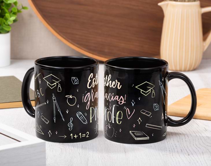 El final de curso es el momento perfecto para decirle a tu profe cuánto le agradeces todo lo que habéis aprendido juntos. Y qué mejor forma de hacerlo que con un regalo tan original como esta taza negra personalizable con el diseño “Gracias, profe”. Lo mejor de todo es que esta taza no es una cualquiera: puedes personalizarla con el nombre del profe. Porque cada docente es único, y su regalo también debería serlo. Personalizarla es muy fácil y rápido: solo tienes que añadir el producto al carrito y acceder al área de personalización, donde podrás escribir el texto que desees y previsualizar cómo quedará impreso. El resultado es un regalo original, hecho a medida, que refleja todo el cariño y agradecimiento hacia esa persona que ha acompañado cada paso del curso.