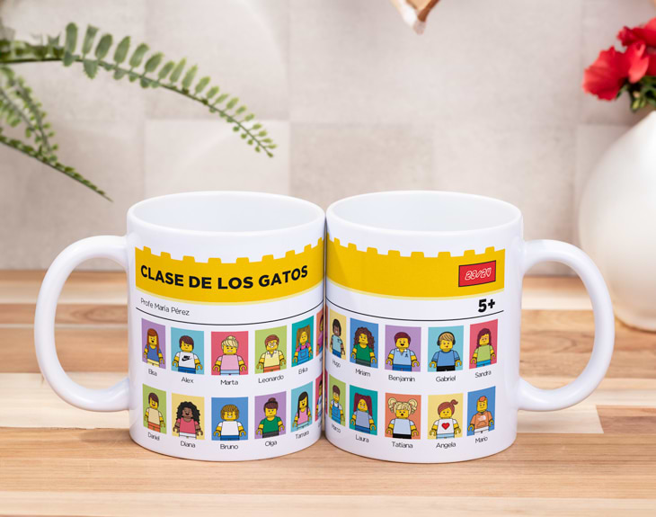 Ahora que se acaba el curso, tenemos la orla más original de todas... ¡La orla de Lego! Imagina representar a toda la clase en forma de Lego, ¿a que es genial? Sin duda, esta taza personalizada con diseño "Orla Lego" es un original regalo para sorprender al mejor profe del mundo. Lo mejor es que esta taza con orla es personalizable, podrás crear a estos avatares Lego como tú quieras. Hay un montón de rasgos y accesorios distintos para elegir. Sin duda, esta lámina es un detalle perfecto que le hará mucha ilusión, es ideal para disfrutar de un buen desayuno. ¡Así nunca se olvidará de su clase favorita! Personalizar esta taza es muy sencillo. El primer paso a seguir consiste en añadir el producto al carrito y entrar al área de personalización. Una vez ahí, ya puedes crear a estos avatares como tú quieras. Pronto estará perfecto y listo para regalar. ¡Será un original regalo para profesores! Al comprar este diseño podrás elegir el tipo de taza que quieres entre nuestras seis opciones disponibles en el desplegable: cerámica, mágica, plástico, con el interior en color, con cuchara o con asa en forma de corazón. En el lado derecho encontrarás la guía de tazas con las características de cada una de ellas. ¡Escoge el estilo y la cantidad de tazas que quieras! Importante: Los huecos en los que no aparezca un personaje se incluirá un corazón.