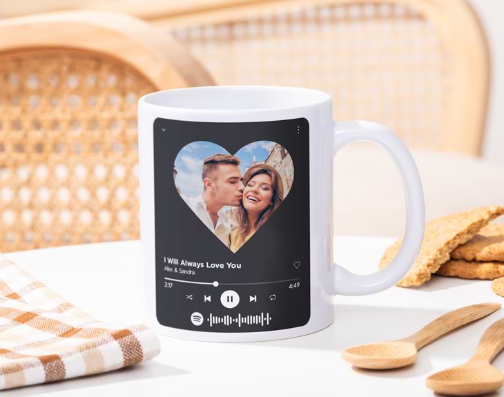 ¿Hay una canción que cada vez que la escuchas te acuerdas de esa persona tan especial? Si siempre que suena te traslada al día al que os conocisteis, a ese baile que nunca olvidarás o a esos viajes en el coche cantándola juntos a todo volumen, esta taza personalizada es un detalle precioso para darle una gran sorpresa. Solamente tienes que escoger una foto que sepas que le va a sacar una sonrisa cada mañana cuando vaya a desayunar y la vea, decirnos el título de esa canción que consigue poneros los pelos de punta y decirnos vuestros nombres. ¡Nosotros nos encargamos de montarlo y hacer la taza más guay del mundo! Si cada día busca en Spotify esa canción para escucharla una y otra vez, le parecerá divertidísimo tener una taza así de original. Al comprar este diseño podrás elegir el tipo de taza que quieres entre nuestras seis opciones disponibles en el desplegable: cerámica, mágica, plástico, con el interior en color, con cuchara o con asa en forma de corazón. En el lado derecho encontrarás la guía de tazas con las características de cada una de ellas. ¡Escoge el estilo y la cantidad de tazas que quieras! Importante: Este producto es una réplica del diseño de reproducción de Spotify, pero NO es un altavoz. ¿Cómo se personalizan los productos Spotify? A la hora de personalizar tus productos relacionados con Spotify, tendrás que contestar a una serie de preguntas. De esta manera… ¡tendrás un regalo original de lo más musical! Cuando llegues al diseñador te encontrarás con la plantilla del producto, con tres apartados a personalizar (texto, foto y código Spotify). Para personalizar cada uno sólo tendrás que hacer click encima de cada cuadrado de personalización. Una vez dado, solo tendrás que escribir el texto y subir la fotografía a nuestro servidor. ¡Podrás modificar el color del texto o su lugar en el diseño! En el momento de añadir esa canción tan característica, no tendrás ningún problema. Escribe la canción o el artista que quieras en el buscador del código Spotify, y a partir de ahí aparecerán una serie de resultados. Solo tendrás que pinchar sobre la canción... ¡no tendrás que hacer nada más! Dependiendo del producto, podrás modificar las características del código: color, fondo o lugar. ¿Cómo se escanea el código? Para poder descubrir de qué canción se trata tendrás que abrir la aplicación de Spotify en tu teléfono móvil y darle al apartado "Buscar". En la parte superior encontrarás un buscador, cuando pulses sobre él verás que en la esquina derecha aparece un icono de una cámara. Al pinchar te abrirá la cámara, únicamente tienes que apuntar al código y automáticamente se reproducirá tu canción.