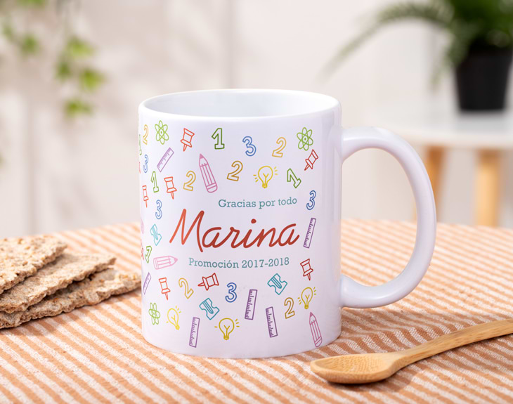 Hay valores que hacen que un profesor o profesora sea alguien único. El cariño con el que enseña, la paciencia que tiene con todos los alumnos, la vocación que muestra en cada clase... Si has tenido la suerte de tener al mejor profe del mundo, tu clase y tú podéis sorprenderle con esta taza personalizada. Es un regalo único y muy especial con el que se acordará de sus alumnos favoritos siempre que la utilice para desayunar. ¡Es un detalle precioso para fin de curso! Si como alumnos queréis agradecer todo el esfuerzo que ha hecho vuestro profe durante todo el curso, no hay mejor manera de hacerlo que con esta original taza. Su diseño es perfecto para cualquier profe porque le hará recordar todo lo que le gusta y es que todos los dibujos que hay tienen que ver con el colegio y la enseñanza. ¡Un regalo con el que se emocionará! Personalizar esta taza es súper fácil. Añade el producto al carrito, entra en el área de personalización y comienza a crear tu diseño. Podrás elegir el color del diseño (verde, azul, amarillo, rosa o multicolor) y después añadir el texto que quieras. Inspírate en la imagen o deja volar tu imaginación. Nosotros nos encargamos del resto y nos aseguramos que quede perfecta y lista para usar. ¡Se convertirá en su taza favorita! Al comprar este diseño podrás elegir el tipo de taza que quieres entre nuestras seis opciones disponibles en el desplegable: cerámica, mágica, plástico, con el interior en color, con cuchara o con asa en forma de corazón. En el lado derecho encontrarás la guía de tazas con las características de cada una de ellas. ¡Escoge el estilo y la cantidad de tazas que quieras!