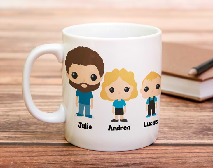 ¿Conoces los famosos muñequitos Tinok? Si tú también adoras a estos divertidos personajes, esta taza personalizada tiene que ser tuya. Solamente tienes que escoger a los miembros que más se parezcan a tus familiares o amigos y tendrás la taza más guay del mundo. Además, también es una gran opción de regalo para esa persona que colecciona Tinoks de todas las pelis y series....¡Se morirá de la ilusión al ver unos con vuestros rasgos y vuestros nombres! Importante: a partir de 6 personajes, la familia irá distribuida en dos filas. Es decir: - Familia de 6 personajes: 3 en la fila superior, y 3 en la inferior. - Familia de 7 personajes: 4 en la fila superior, y 3 en la inferior. - Familia de 8 personajes: 4 en la fila superior, y 4 en la inferior.