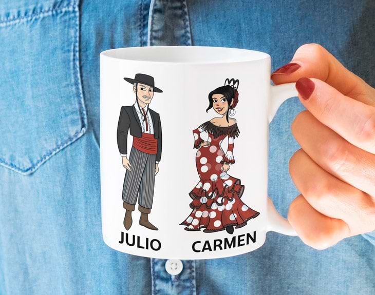 ¡Andalucía tiene un color muy especial! Podríamos nombrar muchísimas regiones españolas maravillosas, lugares únicos de nuestro país que son incomparables con el resto del mundo. Aún así, ¿qué puede haber más bonito que Andalucía? Esta enorme comunidad autónoma cuenta con muchísima historia. Desde los tiempos de Al Andalus hasta la actualidad, son muchos los acontecimientos que han ido sucediendo en Andalucía. Y es que cada provincia es diferente. Da igual si eres de Granada, Sevilla, Córdoba, Huelva, Jaén, Almería, Cádiz o Málaga: eres muy especial. El clima andaluz, su gastronomía, la cantidad de monumentos históricos... ¿quién no se sentiría orgulloso de sus raíces andaluzas? Estamos seguros de que te encanta tu tierra y todo lo relacionado con ella. ¿Vives lejos de allí y quieres tener algo que te recuerde a la magnífica Andalucía? Esta taza personalizada te vestirá lo más flamenco posible. ¡Olé! ¿Siempre has querido probarte uno de esos vistosos trajes de flamenco? ¡Esta es tu oportunidad! Con este regalo original, podrás sorprender a ese andaluz nostálgico que tanto ama su tierra. Podrás crear tu propia familia andaluza, incluyendo un máximo de 8 personajes en la taza. Y es que contamos con más de 100 personajes diferentes. ¡Escoge al que más se parezca y añádelo a la taza! Importante: nuestro equipo de personalización se encargará de ajustar la distribución de los personajes en el producto en función de su tamaño para que se vean lo mejor posible.