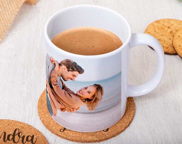 • Taza de cerámica con tu foto y/o diseño en cajita individual. (33 cl) • Posavasos de corcho con texto. • Tarjeta recordatoria.