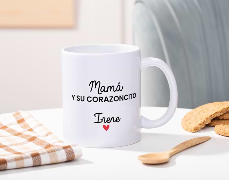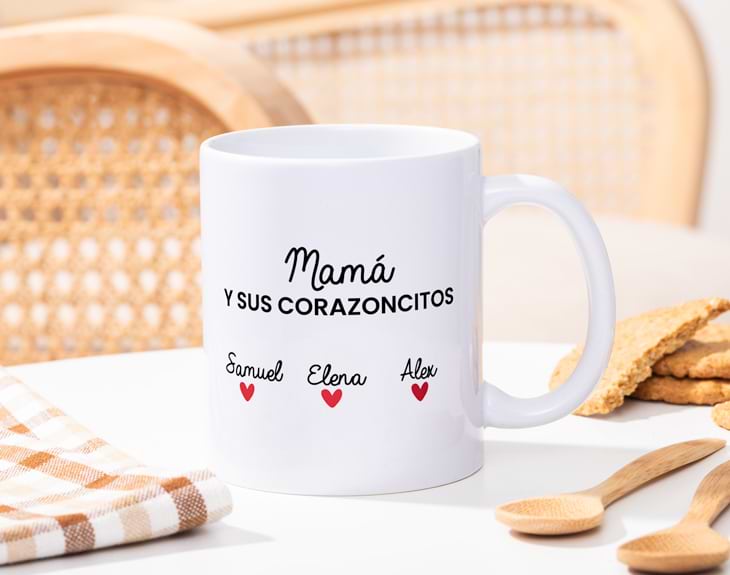 ¿Cuál es la bebida favorita de tu madre? ¿El café o el té? Sea cual sea, tenemos algo que no le puede faltar. Se trata de nuestra taza personalizada con diseño "Corazoncitos de mamá". Es ideal para que disfrute de sus desayunos con su bebida favorita. ¡Conseguirás que empiece el día de maravilla! Sin duda, si quieres sorprender a la mejor mamá del mundo, con esta taza triunfarás seguro. Es una forma de agradecerle todo lo que hace por la familia y demostrarle lo mucho que la queréis. Además, es personalizable. Podrás escribir los nombre de toda la familia. ¡Le encantará! Personalizar esta taza es muy sencillo. El primer paso a seguir consiste en añadir el producto al carrito y entrar al área de personalización. Una vez ahí, ya puedes escribir el nombre que tú quieras. Pronto estará perfecto y listo para regalar. ¡Será un original regalo para madres! Al comprar este diseño podrás elegir el tipo de taza que quieres entre nuestras seis opciones disponibles en el desplegable: cerámica, mágica, plástico, con el interior en color, con cuchara o con asa en forma de corazón. En el lado derecho encontrarás la guía de tazas con las características de cada una de ellas. ¡Escoge el estilo y la cantidad de tazas que quieras!