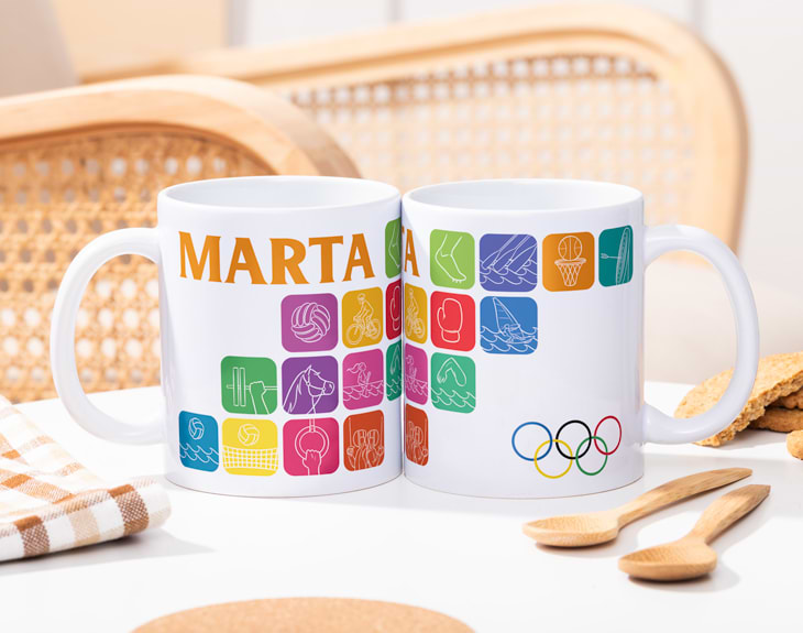 El desayuno es una de las comidas más importantes del día, es imprescindible para tener energía durante todo el día. Por eso, si tu quieres que tu deportista favorito desayune como un auténtico campeón, sorpréndele con nuestra taza personalizada con diseño "Olimpiadas". Es ideal para que pueda disfrutar de su bebida favorita a la hora del desayuno. Además, lo mejor que tiene es que es personalizable, podrás escribir el nombre que tú quieras. Sin duda, se convertirá en un original regalo para esa persona que sueña con participar en los Juegos Olímpicos. Personalizar esta taza es muy sencillo. El primer paso a seguir consiste en añadir el producto al carrito y entrar al área de personalización. Una vez ahí, ya puedes escribir el nombre del mejor atleta. Pronto estará perfecta y lista para regalar. ¡Será original regalo para deportistas! Al comprar este diseño podrás elegir el tipo de taza que quieres entre nuestras seis opciones disponibles en el desplegable: cerámica, mágica, plástico, con el interior en color, con cuchara o con asa en forma de corazón. En el lado derecho encontrarás la guía de tazas con las características de cada una de ellas. ¡Escoge el estilo y la cantidad de tazas que quieras!