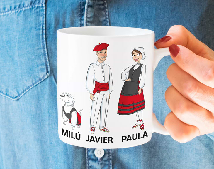 La belleza del País Vasco es incomparable. Todos conocemos zonas de nuestro país que parecen sacadas de un cuento, con unos paisajes fantásticos, casi irreales. Eso sí, ¿existe una región española más bella que el hogar de los pintxos y el marmitako? ¡La respuesta está clarísima! Esta comunidad autónoma no pasa desapercibida para los españoles, siendo una de las regiones con más historia y cultura de toda España. Esa magnífica fusión entre naturaleza e innovación convierten al País Vasco en una comunidad única, sin igual, que sabe unir varios su apuesta por lo moderno con la tradición y la cultura. ¿Quién no ha querido pasear alguna vez por las curiosas calles de San Sebastián? ¡Lo tiene absolutamente todo! Si tienes un amigo vasco que siempre te da la tabarra con lo que añora su tierra o con lo increíble que es el Guggenheim, esta taza personalizada está hecha para él. Si toda tu familia es de esta comunidad autónoma, tienes la oportunidad de hacerles un regalo inolvidable. Gracias a este regalo original, podrás crear tu propia familia vasca, con ese mítico traje regional que tantas veces hemos visto en fiestas y celebraciones. Además, contamos con más de 100 personajes diferentes, por lo que podrás encontrar al vasco/a que más te represente en este producto. Importante: nuestro equipo de personalización se encargará de ajustar la distribución de los personajes en el producto en función de su tamaño para que se vean lo mejor posible.
