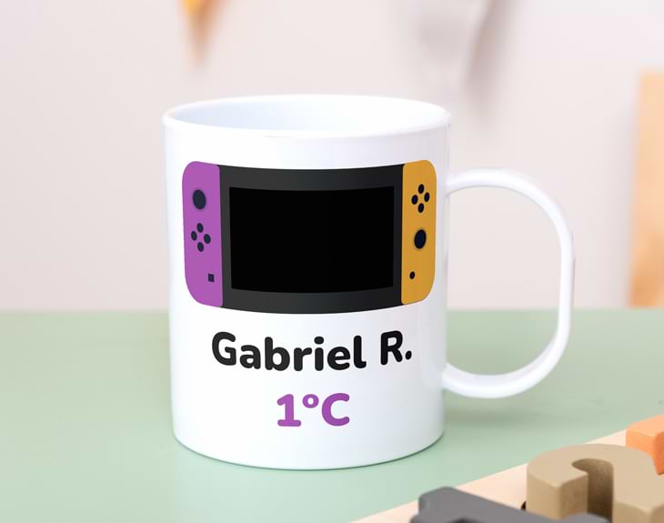 Tanto en casa como en el cole, hay un accesorio que no puede faltar en la mochila ni en la mesa del desayuno: una taza de plástico personalizada que combine con la energía y el estilo gamer de tu peque. Y si es fan de la consola Switch, esta taza con diseño inspirado en sus mandos favoritos le va a encantar. Pensada para seguir el ritmo incansable de los más pequeños, esta taza ligera y resistente, además de estar fabricada en plástico libre de BPA, es perfecta para cualquier momento del día. Desde el desayuno en casa hasta la merienda en el parque o el recreo en el cole, siempre está lista para acompañarlos allá donde vayan. Esta taza personalizada con nombre tiene dos campos para que escribas su nombre, un apodo o una frase corta. Elige entre varios diseños coloridos inspirados en videojuegos para darle un toque único que evitará confusiones en clase y la hará su favorita. Es el regalo de vuelta al cole, cumpleaños perfecto, convirtiendo un objeto cotidiano en algo divertido y original que refleja su pasión gamer. Personalizarla es muy fácil, añade al carrito, elige el diseño, escribe el nombre o texto que quieras y listo. Un regalo original que usará todos los días, en cualquier lugar. Importante: El plástico de la taza no contiene BPA. Esta taza es apta para lavavajillas y microondas.