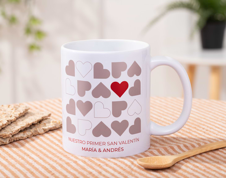 ¿Es el primer San Valentín que pasáis juntos?¡Esto no ha hecho más que empezar! Si aunque todavía os quedan un montón de aventuras y buenos momentos por vivir, tienes claro que es la persona con la que quieres compartir tu vida, esta taza personalizada es perfecta para darle un bonito regalo en vuestro primer 14 de febrero. Y es que, no te ha hecho falta mucho tiempo para darte cuenta de que es tu otra mitad y que la química que sentís no la habías tenido con nadie antes. Porque os entendéis, os queréis, os respetáis y os complementáis a la perfección, este diseño está hecho para vosotros. Solamente tienes que decirnos vuestros nombres y personalizaremos el diseño para que guardéis para siempre un bonito recuerdo del primer San Valentín juntos...¡Y es que es el primero de muchos!