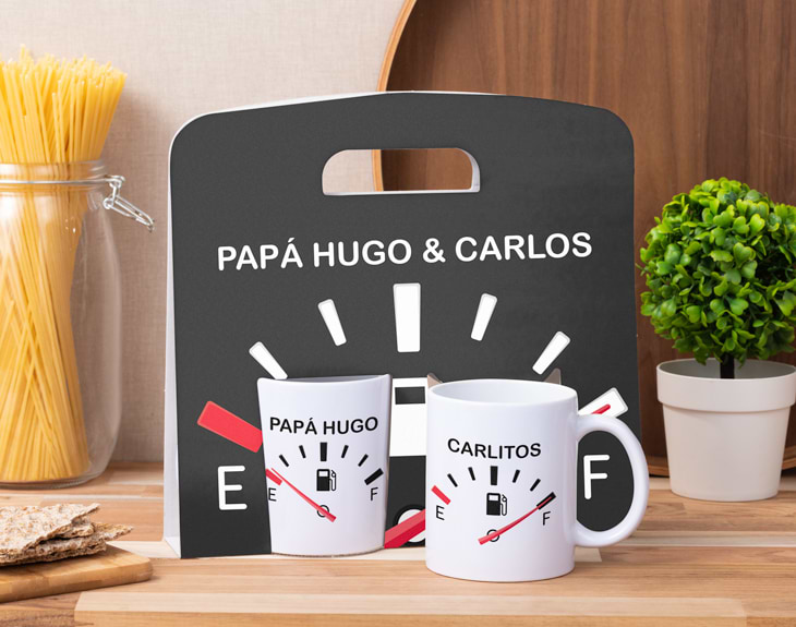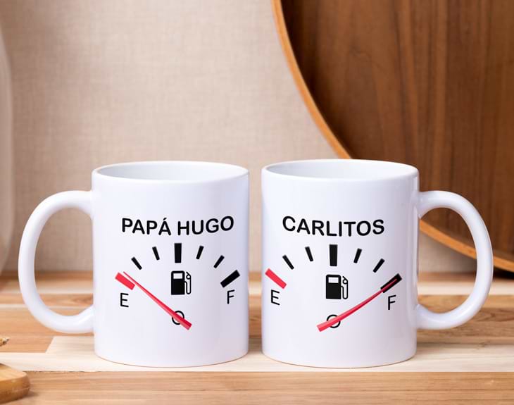 Ser papá agota las energías de cualquiera. Criar y educar a una pequeña criaturita puede ser una de las cosas más extenuantes que te pueden suceder en esta vida. Además, los hijos son expertos en cansar a sus padres: mientras que los primeros tienen una energía increíble, los segundos tienen que luchar contra su fatiga, para cuidarlos lo mejor posible. ¿Te gustaría agradecerle todo lo que ha hecho? ¡Regálale estas tazas personalizadas con estuche! ¿Acaso has visto algún diseño tan chistoso y emotivo como este? Las tazas están planteadas con un indicador de gasolina, que se encuentra al mínimo para el padre y al máximo para el hijo. Y es que un hijo agota los depósitos de combustible de cualquiera, incluso de los padres con más paciencia y aguante. Todos los papás necesitan un buen descanso, para reponer sus niveles de energía después de un duro día de trabajo. Por eso, estas tazas con estuche incorporado son perfectas para todos esos padres que necesitan tomarse un buen café o té para aguantar el día. ¡Ten un detalle con tu padre y dale este divertido regalo original! Medidas: 26,5 cm x 25,5 cm.