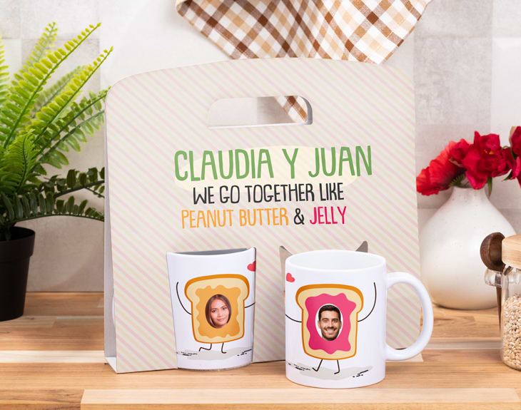 Se nos hace la boca agua solo con pensar en una tostada de mantequilla de cacahuetes y mermelada. No hay nada que se complemente mejor...¿o sí? Si tu pareja y tú formáis incluso mejor equipo que estos dos alimentos, estas tazas personalizadas están hechas para vosotros. Se trata de un regalo muy original y divertido para dejar sin palabras a tu compi de aventuras y de vida. ¿Nunca habías encajado tanto con alguien?¿Sobran las palabras para entenderos? Si juntos sois mucho más fuertes, estas tazas tan graciosas tienen vuestro nombre. Solo necesitamos que escojas las fotos más divertidas y nosotros nos encargamos de hacer que sea el detalle más increíble del mundo. ¡Seguro que no se lo espera y al verlo se parte de risa! Medidas del estuche: 26,5 cm x 25,5 cm.