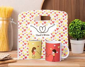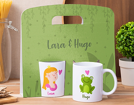 • Tazas para parejas personalizadas (33 cl). • Tarjeta recordatoria.