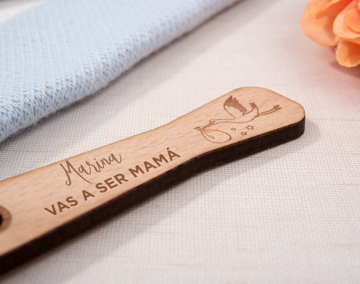 Cuando una mujer está embarazada, suele ser la primera en enterarse de la noticia para después contarla a toda su familia y amigos. Pero, ¿y si le regaláis el mejor recuerdo del mundo? Nuestro test de embarazo de madera personalizado es una idea diferente para que pueda guardar un recuerdo muy especial del mejor día de su vida. Y es que no todos los días se dan noticias tan buenas ni se anuncia un nacimiento, por lo que este bonito detalle es perfecto. A cualquier mamá le gustaría guardar un recuerdo del día que se enteró que estaba embarazada. Este original predictor de madera es el mejor regalo que le podéis hacer a esa persona que va a pasar nueve meses con su pequeño bebé. Este precioso adorno quedará genial en cualquier rinconcito de la casa y cada vez que lo vea se emocionará recordando ese día tan especial y bonito. ¡Le encantará! Personalizar este adorno es muy fácil. Solo tienes que añadir el producto al carrito y entrar en el área de personalización. Desde ahí, podrás elegir el diseño que más te guste (cigüeña, caballito, pañal, chupete...) y después escribir el nombre de la madre en el espacio vacío. Colócalo para que quede perfecto y listo. ¡Será el mejor regalo del mundo! Medidas del adorno: 16 x 2 cm. Medidas de la caja: 18 x 5 x 2 cm. Material del adorno: madera y metacrilato. Importante: este test de embarazo es únicamente un elemento decorativo, no se puede utilizar.
