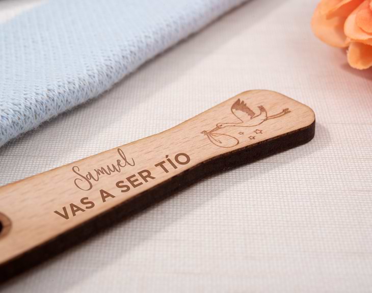 Un embarazo es la mejor noticia que se le puede dar a la familia. El nuevo miembro de la familia tendrá a todos pendiente de él, pero seguro que como su tío no hay nadie. Por eso, no hay mejor forma de sorprenderle que con este test de embarazo de madera personalizado. Es la mejor manera de que recuerde ese instante para siempre y tenga el mejor regalo del mundo de parte de su sobri favorito. ¡Le encantará! El nacimiento de un niño o niña hará que su tío esté loco por cuidarle y consentirle en todo momento. ¡Porque no hay mejor relación que la de tío y sobrino! Si quieres darle la mejor noticia del mundo hazlo con nuestro original predictor de madera de 16 centímetros de largo y hecho tanto de madera como de metacrilato en su parte inferior. Este vendrá presentado en una pequeña caja de color negro, de 18 centímetros de longitud. ¡Será un detalle único! Estamos seguros de que tu hijo o hija tendrá al mejor tío del mundo. ¡Haz que se emocione con este súper detalle! Para personalizar este adorno solo tendrás que añadir el producto al carrito y entrar en el área de personalización, donde encontrarás la plantilla de este predictor tan original. ¡Escoge el diseño disponible entre las opciones que encontrarás y clica sobre el cuadro de texto para crear este regalazo! Medidas del adorno: 16 x 2 cm. Medidas de la caja: 18 x 5 x 2 cm. Material del adorno: madera y metacrilato. Importante: este test de embarazo es únicamente un elemento decorativo, no se puede utilizar.