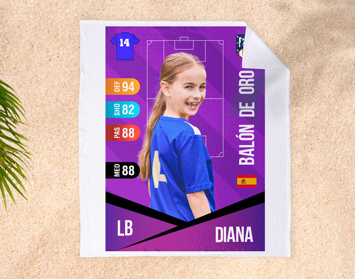 Sorprende a tu peque fanático del deporte con esta toalla personalizada con diseño de cromo de fútbol. Es un regalo original, divertido y muy práctico, ideal para niños y niñas que se pasan el día viendo partidos, jugando al fútbol y soñando con ser su jugador favorito. Podrás personalizar todos los textos y añadir una foto para que tenga su propia ficha de jugador, lo que le hará una ilusión enorme. Además de ser un detalle único, es perfecta para llevar al campamento, la piscina o la playa, y evitar así que se confunda con las toallas de los demás. ¡Nunca más volverá a perderla! Puedes elegir entre modelo individual o doble, y entre tejido de microfibra o algodón, según lo que más se adapte a tus necesidades. No te preocupes que la personalización es muy sencilla: solo tienes que añadir el producto al carrito y acceder al área de personalización, donde podrás rellenar todos los datos, incluir el nombre, escribir los textos que quieras y subir una foto. En pocos pasos tendrás un regalo original para este verano, pensado para disfrutar al máximo con los más peques. Especificaciones: - Toalla microfibra individual: 160 x 80cm. - Toalla algodón individual: 140 x 79cm. - Toalla microfibra doble: 160 x 180cm. - Toalla algodón doble: 160 x 145cm. Material de la toalla algodón: 100% poliéster en la parte impresa y 100% algodón en la parte inferior.