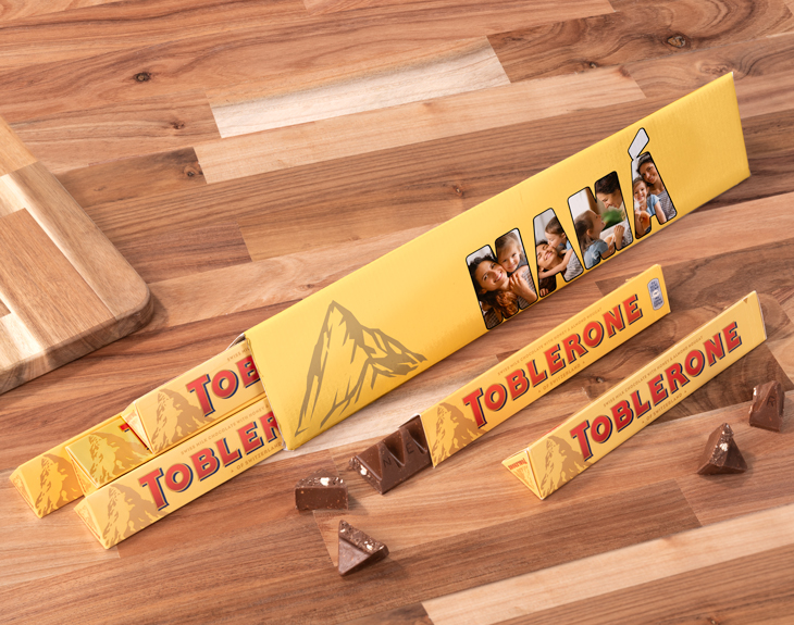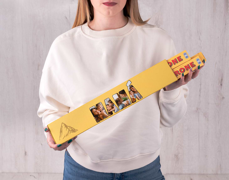 Las madres se merecen todo el cariño, el amor y el respeto del mundo. Primero por ser madres, porque es lo más especial que te puede pasar y en segundo lugar, por todas las cosas que hacen por sus hijos. Decirle lo mucho que le queremos y lo importante que es para nosotros, será súper fácil con este toblerone XL personalizado. El mejor regalo que le podemos hacer a nuestra madre para que se sienta de lo más especial cuando lo reciba, ya sea un día por sorpresa o en algún día importante para ella. En fechas como el Día de la Madre, su cumpleaños, Reyes o Navidad, queremos que nuestra madre se sienta la más especial de todas. Por eso, si la tuya es muy golosa y amante del chocolate, esta original tableta XL de toblerone será el regalo perfecto en cualquier ocasión. Regalar chocolate siempre es una buena opción y más si es uno de los mejores del mundo. Si a una deliciosa tableta de chocolate con leche de origen suizo nadie puede resistirse... ¡no podrán hacerlo a 8 tabletas de 100 gramos cada una! seguro que quieres saber como puedes personalizar este toblerone XL. ¡Es muy sencillo! Entra en el apartado de personalización del producto. Primero, añade tus fotos favoritas en cada una de las letras que forman la palabra 'MAMÁ'. Después, podrás poner el texto que quieras en los dos lados restantes que forman la caja (su nombre, una breve dedicatoria...) Podrás previsualizar en todo momento cómo queda el diseño y ajustarlo para que quede perfecto. ¡Personaliza este toblerone como quieras! Medidas: 42,5 x 8 cm. Relleno: 8 tabletas de Toblerone de 100 gr.