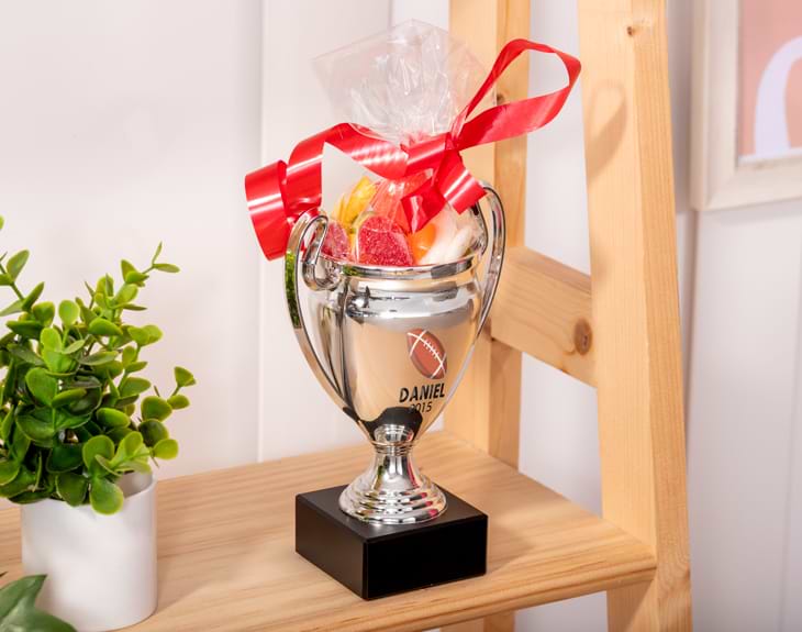 ¿Quieres sorprender con un premio único y lleno de personalidad? Nuestro trofeo personalizado es perfecto para destacar a los mejores en cualquier ocasión: desde competiciones deportivas hasta concursos escolares, y mucho más. Este trofeo con chuches es el toque más dulce para premiar. Incluye una selección variada de golosinas y es ideal para celebrar a los campeones de cualquier disciplina. Puedes elegir el deporte, tenemos baloncesto, fútbol, tenis, rugby o voleibol, añadir el nombre del ganador o una frase corta y así crear un premio original, divertido y con mucho estilo. Sin duda, harás muy feliz al merecido ganador y convertirás esa celebración en un momento inolvidable y delicioso. También es perfecto como detalle en eventos o fiestas escolares. Una opción ideal para entregar premios personalizados con chuches que combinan diversión, dulzura y reconocimiento en un solo regalo. Y lo mejor: personalizarlo es facilísimo. Solo tienes que añadir el producto al carrito, elegir el deporte y escribir el nombre. Listo tendrás un detalle dulce para premiar, una forma creativa y deliciosa de motivar tanto a pequeños como a adultos. Características del trofeo: -Peso: 604 g. -Medida: 18 x 15 cm (puede variar unos centímetros) -Material de la copa: plástico y metal. -Material de la base: mármol. Características de la bolsa de chuches: - Medidas: 22 x 7,5 centímetros. - Peso: 125 gr. aproximado.