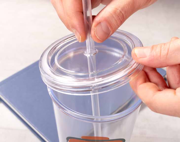 • Vaso plástico personalizado con tapa y pajita reutilizable. • Tarjeta recordatoria.