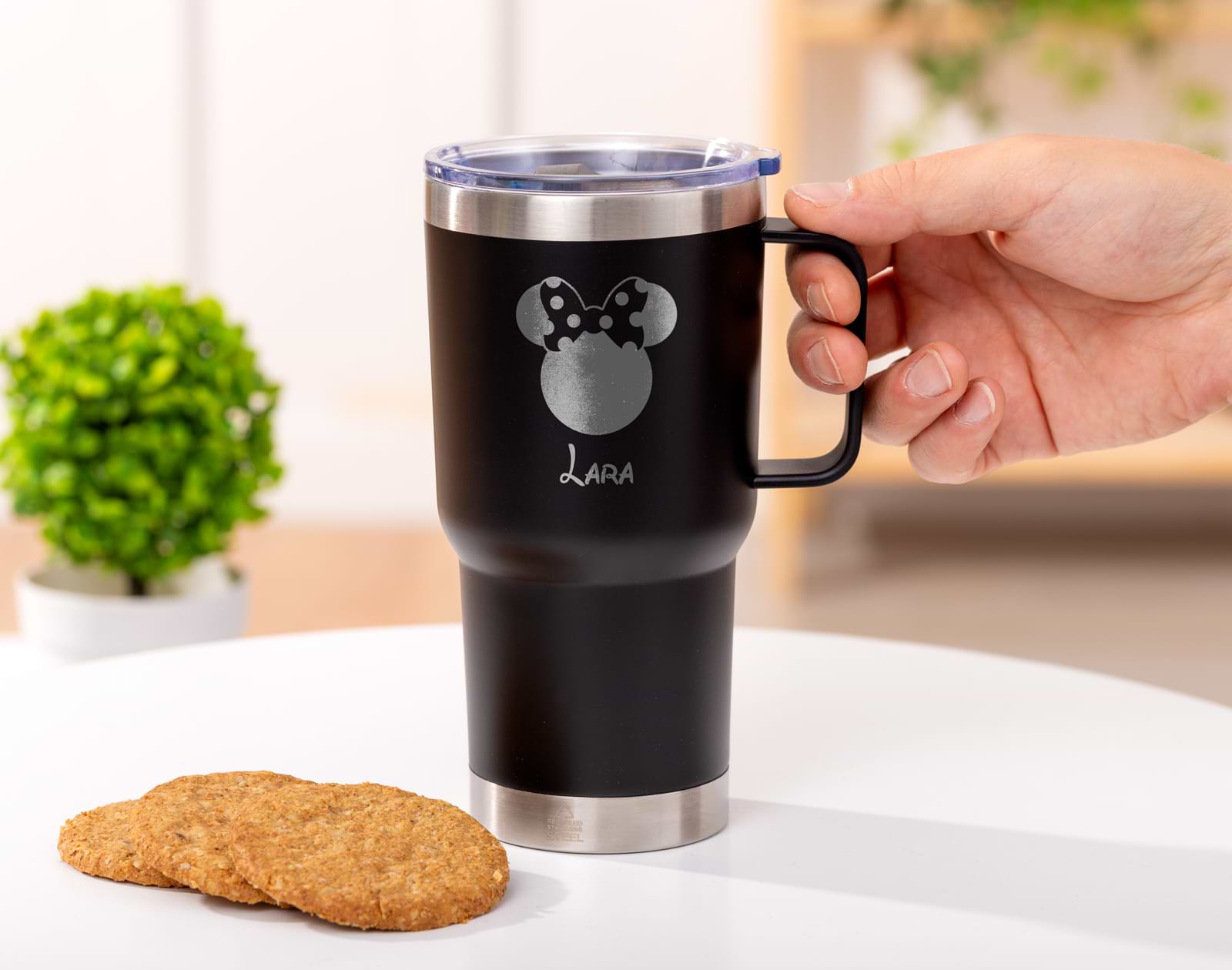 No importa la edad, ¡a todos nos encanta Mickey y Minnie Mouse! Estos dos personajes tan icónicos de Disney nunca pasan de moda, y seguro tienes a alguien especial que es fan de ellos. Por eso, te traemos una opción perfecta para regalar en un cumpleaños o cualquier otra fecha especial: nuestro termo de viaje personalizado con diseño "Mickey & Minnie". Un detalle original para quienes disfrutan de su café fuera de casa. Imagina la ilusión de esa persona al recibir un regalo tan original, su propio nombre debajo de Minnie o Mickey. Además, puedes elegir entre cuatro colores diferentes para personalizar el termo al gusto. Además, Lo mejor de este termo es que ¡mantiene tanto el frío como el calor! Con un diseño inspirado en los termos Stanley, podrás encajarlo en el posavasos del coche o llevarlo cómodamente con su práctico agarre. Además, ¡es personalizable! Podrás añadir el año de nacimiento y las iniciales de quien lo reciba, y nosotros nos encargaremos de grabarlas para que no se borren con el uso. ¡Le encantará! Fabricado en acero inoxidable reciclado de doble pared se trata de un vaso super resistente y duradero, perfecto para utilizar a diario. Cuenta con un dosificador en la tapa para evitar derrames y una capacidad de 600 ml, ideal para tener siempre disponibles sus cafés, tés o su agua bien fresca. ¡Seguro que le da muchísimo uso! Añade el producto al carrito para personalizar este original termo. ¡Pronto tendrás el regalo más práctico del mundo! Capacidad: 600 ml. Medida: 8,80 x 17,50 cm. Material: Acero Inoxidable, doble pared. Libre de BPA. Colores disponibles: negro y gris.