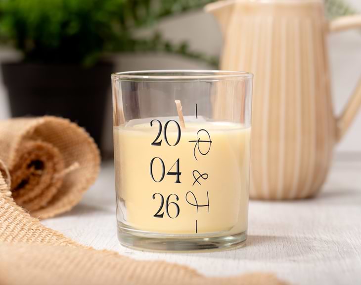 Si estáis buscando un detalle elegante, bonito y con significado para regalar a vuestros invitados, la vela personalizada "Fecha de amor" es la opción ideal. Un recuerdo especial que iluminará y perfumará sus hogares, recordándoles siempre ese día tan importante. Este diseño delicado permite personalizar la vela con vuestras iniciales y la fecha de la boda, creando un regalo lleno de encanto. Es perfecto para colocarlo en cualquier rincón y añadir un toque cálido y aromático a la decoración. Además, podréis elegir entre diferentes aromas disponibles. Personalizar esta original vela es muy fácil: solo tenéis que añadir la vela al carrito y acceder al área de personalización. Una vez allí, escribid vuestras iniciales y la fecha que queráis recordar. Nosotros nos encargaremos de que quede perfecta, lista para entregar como un regalo original para bodas. Medidas: Altura: 8 cm.