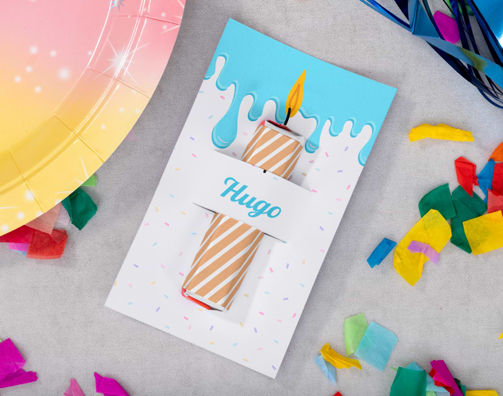 ¿Tu peque es fan de las chocolatinas Kinder y pronto cumple años? Entonces, esta velita de chocolate Kinder personalizada es perfecta para tener un detalle dulce con él o ella y hacerle muy, muy feliz. Además, ¡le encantará porque es una velita que no se sopla, sino que se come y se disfruta! Esta velita sorpresa con Kinder es ideal para celebrar un cumpleaños de forma divertida. Tiene forma de vela a juego con la chocolatina Kinder y sus colores y diseño le dan ese toque festivo que queremos para un día tan especial. Es tan tierna como su delicioso sabor a chocolate por dentro. Perfecta como regalo de cumpleaños para niños y adultos, porque los chocolates Kinder nos encantan a todos, sin importar la edad. Y, claro, ¡a todos nos gustan las sorpresas en nuestro día! También es una opción estupenda como detalle para fiesta infantil. Puedes personalizarlas con el nombre del cumpleañero o incluso con el de cada uno de los pequeños invitados, para darle un toque aún más especial. Personalizar esta velita de chocolate es muy fácil: solo añádela al carrito, elige el diseño que más te guste para la velita y escribe el nombre. Después, selecciona el diseño para la barrita Kinder. Así de simple, tendrás un regalo original de cumpleaños que combina dulzura y celebración en un solo detalle. Medidas del cartoncito: 12 x 7,5 cm. Peso de la barrita: 12,5 gr.