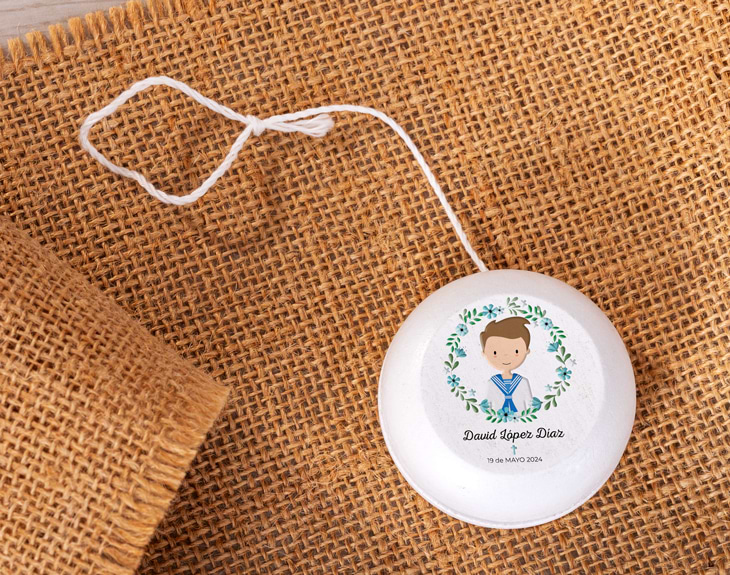 ¿Quieres sorprender a todos los invitados a la Primera Comunión de tu hijo con un regalo de lo más divertido? Seguro que no podrán olvidar este día gracias a este yo-yo personalizado, hecho tanto para niños como para adultos. ¡Un yo-yo con el que disfrutar de ese día tan especial! Si estás pensando en un detalle curioso y original para todos tus seres queridos que no han querido perderse este día, este yo-yo con diseño de comuniones es ideal para la ocasión. El yo-yo cuenta con un diámetro de 5 centímetros y un grosor de 1,5 centímetros. ¡El diseño se imprimirá sobre su color blanco! Un regalo original para Primera Comunión como este podrá ir personalizado con el diseño y toda la información de la celebración. ¡Así siempre tendrán un recuerdo de este día tan especial en la vida de tu hijo o hija! Añade el producto al carrito y entra en el área de personalización para crear el diseño que quieres. ¡Escoge el dibujo que más te guste y clica sobre los cuadros de texto para personalizarlos! Medidas: 8 centímetros de diámetro. • Consulte precio por cantidades.