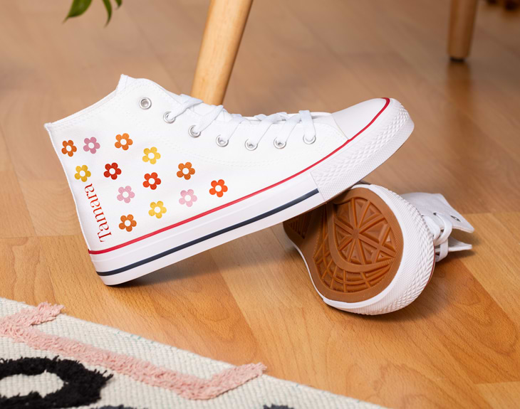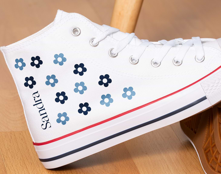 Si estás harto/a de llevar siempre las mismas zapatillas y quieres darle un toque diferente a todos tus looks, necesitas estas zapatillas personalizadas con un diseño único y súper guay. Estamos seguros de que se convertirán en tu accesorio favorito porque además de ser muy cómodas y perfectas para el día a día, su diseño lleno de florecitas hace que este calzado sea único. ¡Nadie tendrá uno igual! Si quieres sorprender a alguien especial con un regalo único, sin duda estas originales zapatillas son todo lo que necesitas para triunfar en cualquier ocasión. Y como queremos que sean diferentes a cualquier cosa que hayas tenido, podrás personalizarlas totalmente a tu gusto, desde el color (blancas o negras), la talla (para peques y para adultos) hasta el diseño de flores que puedes elegir el color que más te guste. ¡Son lo más! Para personalizar estas zapatillas, lo único que tienes que hacer es entrar en el área de personalización y seguir los pasos que te indicamos. Primero indícanos qué color y talla quieres. Después, ya podrás elegir el color del diseño que quieras y completarlo con un nombre, así de fácil. ¿Estas zapatillas serán el mejor regalo del mundo! Importante: se personaliza con el mismo diseño la cara externa de cada zapatilla. Importante: la guía de tallas indica el tamaño de la suela.