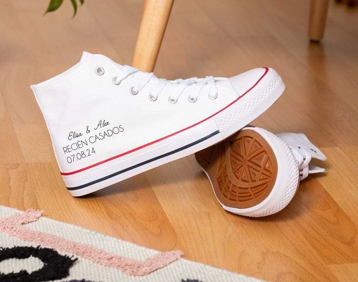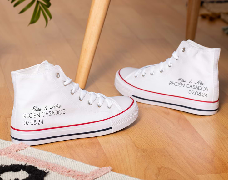 ¿Hace poco que se han casado tus mejores amigos? Si te alegras un montón por ellos, está claro que tienes que darles la enhorabuena de alguna forma especial y con nuestras zapatillas personalizadas con diseño "Recién casados" es la mejor manera. ¡Les encantará! Y es que una fecha tan especial como el día de su boda tiene que estar siempre presente. Por eso, estas zapatillas harán de esa fecha un recuerdo inolvidable. Lo mejor que tienen es que son personalizables, podrás escribir lo que tú quieras. ¡Se convertirán en sus zapatillas favoritas! Personalizar estas zapatillas es muy sencillo. El primer paso a seguir consiste en añadir el producto al carrito y entrar al área de personalización. Una vez ahí, ya puedes escribir las iniciales junto a la fecha más especial. Pronto estarán perfectas y listas para regalar. ¡Será un original regalo para parejas! Importante: se personaliza con el mismo diseño la cara externa de cada zapatilla. Importante: la guía de tallas indica el tamaño de la suela.